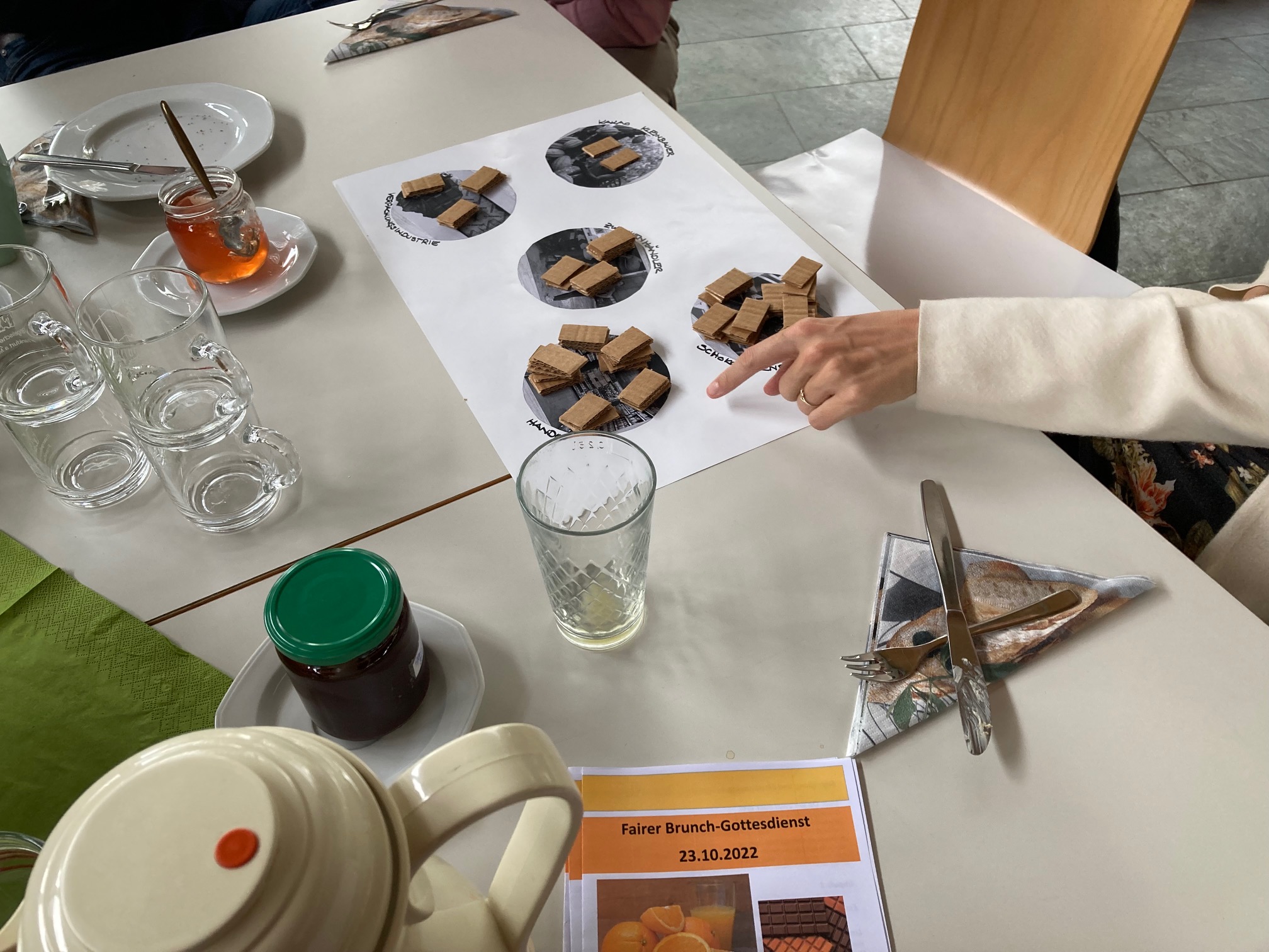 Beim Ankommen im Gemeindesaal spielt eine Jazzband. Der kleine Altartisch steht nicht zentral, sondern dezent in einer Ecke. Die Gottesdienstbesucher*innen finden Platz an hübsch gedeckten Tischen. Brötchen und Kaffee stehen schon bereit und an der Seite ist ein Büffet mit fair gehandelten Frühstückszutaten, Käse aus dem Bioladen und selbstgekochter Kürbissuppe aufgebaut. Nach einer kurzen Begrüßung und einem gemeinsamen Lied kommt ein erster Impuls. Orangensaft wird an den Tischen verteilt. Betroffen sitzt eine ganze Tischgruppe um ein Glas mit 10 ml Saft, während auf einem anderen Tisch viele Gläser vor einem einzelnen Gast stehen, was ihm sichtlich peinlich ist. Ist das „fair“?